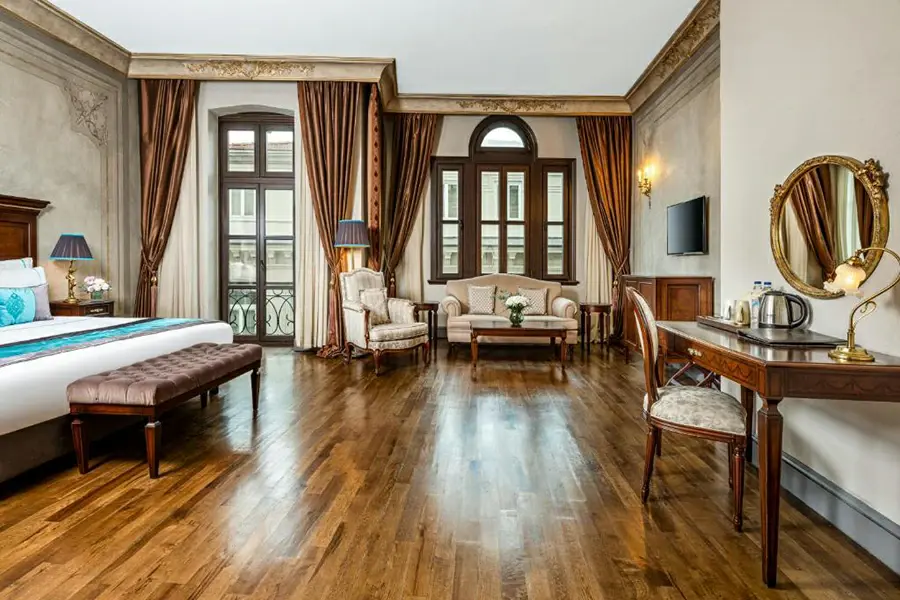 اتاقهای دولوکس هتل پلازو دونیزتی استانبول، با مساحت مناسب و طراحی هوشمندانه، انتخابی ایدهآل برای زوجها و مسافرانی هستند که به دنبال فضایی دنج و راحت میگردند. این اتاقها با تختهای دونفره بزرگ و باکیفیت، فضایی آرامشبخش برای استراحت شبانه فراهم میکنند. میز کار مجزا، امکان انجام امور اداری را برای مسافران تجاری مهیا میسازد. همچنین، وجود یک نشیمن کوچک با مبلمان راحت، فضایی دلپذیر برای صرف چای یا قهوه و تماشای تلویزیون ایجاد کرده است. طراحی داخلی اتاقهای دولوکس هتل پلازو دونیزتی استانبول با استفاده از رنگهای ملایم و الهام گرفته از معماری اصیل استانبول، حس آرامش و تعلق خاطر را در مهمانان تقویت میکند. جزئیات هنری به کار رفته در دکوراسیون، از جمله تابلوهای نقاشی و اشیاء تزئینی، جلوهای خاص و منحصربهفرد به این اتاقها بخشیدهاند. با اقامت در این اتاقها، تجربهای دلنشین از مهماننوازی اصیل ترکی را در قلب استانبول احساس خواهید کرد.